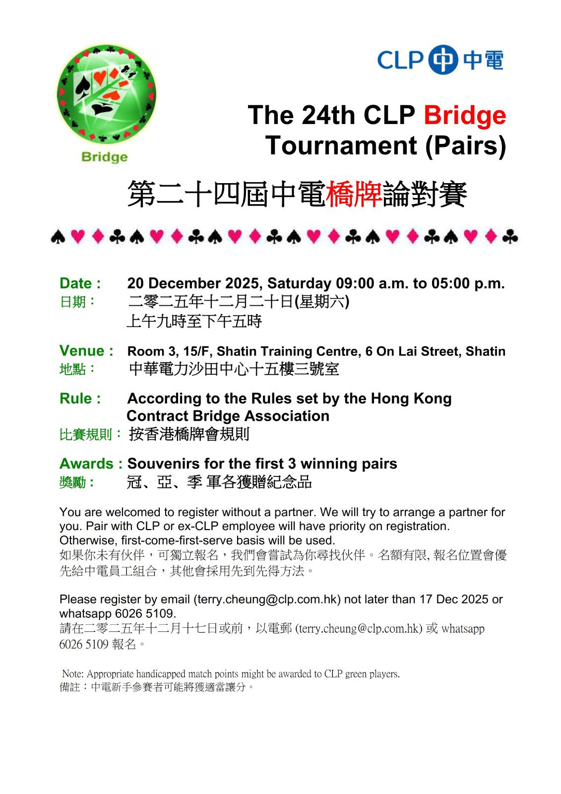 Bridge House is now recruiting voluntary helpers for her daily events. Through the service, you will know more about the game - bridge. Certificates will be given on request. If you are interested or have any enquiries, please feel free to email to HKbridgehouse@hotmail.com. |